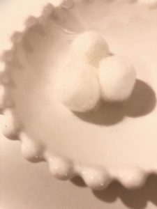 ペパーミントの精油を小皿に置いたコットンボールに垂らしています。